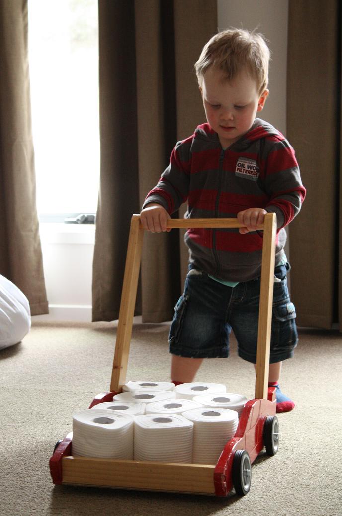 I found him building a road out of the 48 pack of toilet rolls he had opened up: